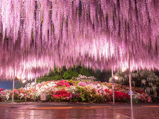 1997年にオープンした「あしかがフラワーパーク」は、大藤をはじめ、チューリップやバラ、あじさい、アメジストセージなど、一年中さまざまな花で彩られているスポット。なかでも樹齢160年にもなる大藤や長さ80mにおよぶ白藤のトンネルは、栃木県天然記念物にも指定。4月の半ばからの約1ヵ月間が見頃で、その時期に合わせて「ふじのはな物語」が開かれます。冬には園全体をイルミネーションで彩る「光の花の庭」が開催。「あしかがフラワーパーク」でしか見られない光と花のコラボレーションは、見応え抜群です。日帰り旅行の締めに訪れてみるのはいかがでしょうか。